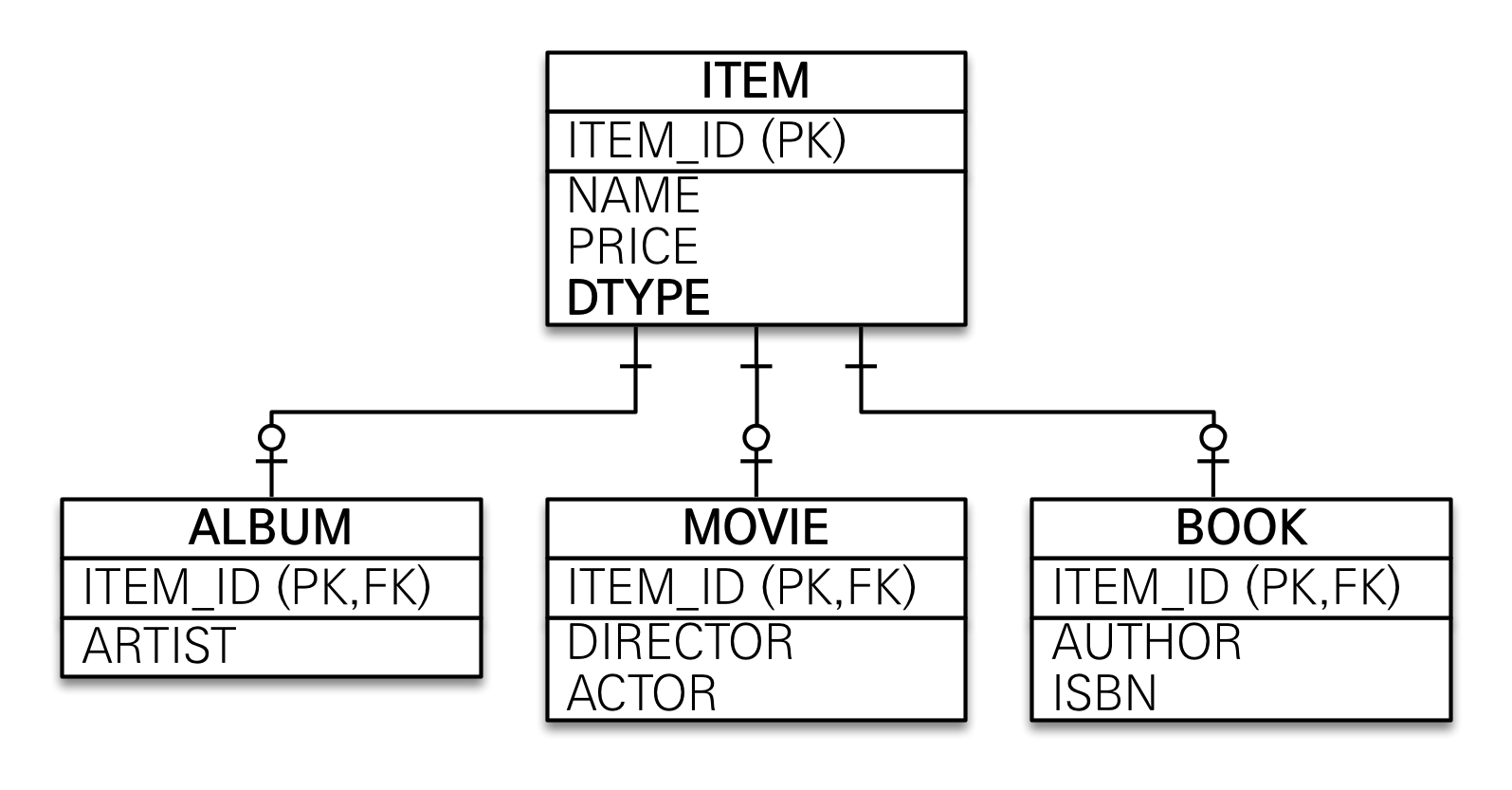 슈퍼타입 서브타입 논리 모델을 실제 물리 모델로 구현하는 방법은 다음과 같다.(DB의 전략)