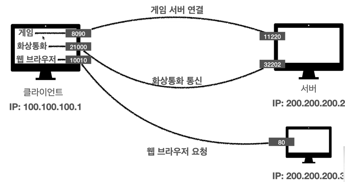 내가 만약 웹브라우저를 사용 한다면 IP 200.200.200.3의 80포트를 사용할거야 라고 패킷을 쏘게 된다. 반대로 웹브라우저 서버에서는 HTML을 만들어서 나한테 응답을 하는데 100.100.100.1의 포트 10010번에 보내게 된다.(처음 패킷을 보낼 때 출발지 IP와 출발지 PORT의 값까지 포함하여 보내기 때문에 응답할 때 이걸 사용한다.)