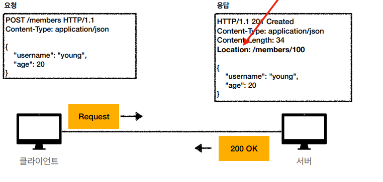 201 Created는 POST 메서드를 예로 들 수 있다. 클라이언트가 POST로 리소스 생성을 요청하면 서버에서는 요청을 받고 자원의 신규 리소스를 만들고, 201 Created로 내릴 때 리소스의 경로를 포함하여 내려준다.