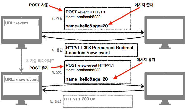 - 리다이렉트시 요청 메서드와 본문을 유지한다.(요청 메서드를 변경하면 안된다. MUST NOT)