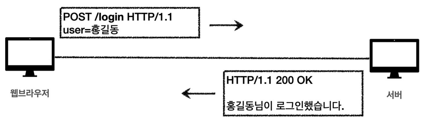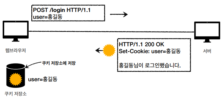-> 웹 브라우저가 POST로 로그인을 하면 서버는 Set-Cookie: user=홍길동을 쿠키로 말아서 응답을 한다.