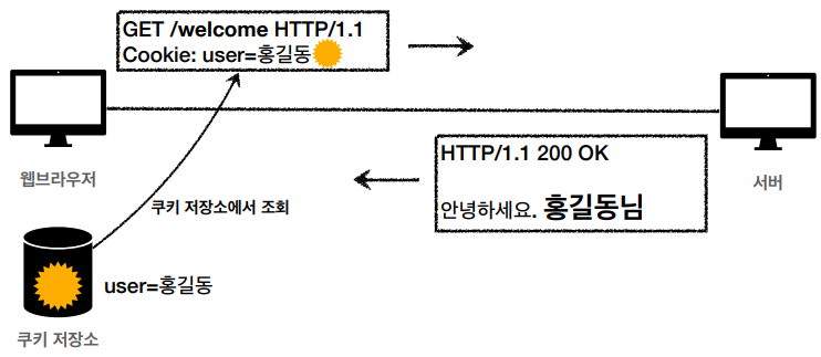 웹 브라우저 내부에는 쿠키 저장소가 있다. 그 저장소에 user=홍길동을 저장해둔다.