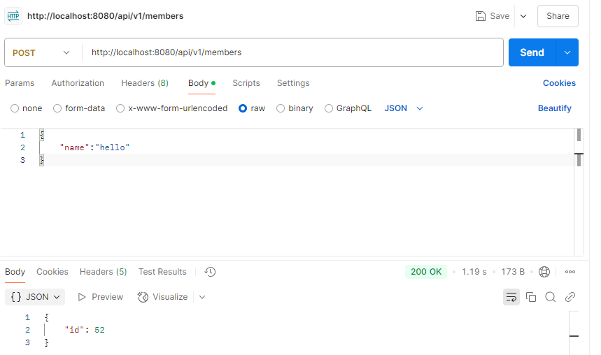JSON 형식이고 POST를 하면 hello와 id가 저장되는 것을 확인할 수 있다.