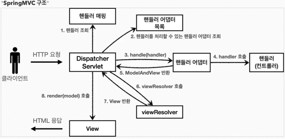 기존 만들었던 MVC 프레임워크와 사실 스프링MVC 구조는 거의 동일하다(약간 이름에 차이가 있을 뿐)