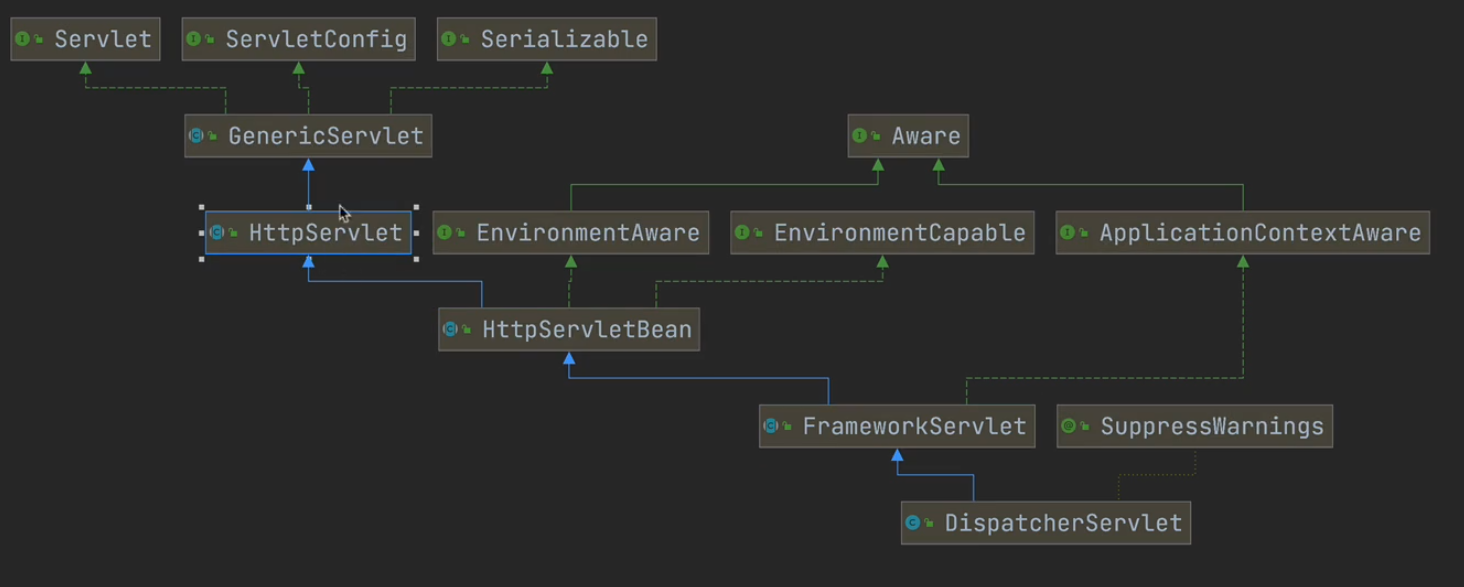 - DispatcherServlet -> FrameworkServlet -> HttpServletBean -> HttpServlet