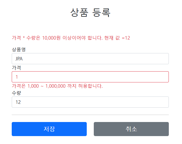 고객이 상품 등록 폼에서 상품명을 입력하지 않거나, 가격, 수량 등이 너무 작거나 크게 설정되어 검증 범위를 넘어서면, 서버 검증 로직이 실패해야 한다. 이렇게 검증에 실패한 경우 고객에게 다시 상품 등록 폼을 보여주고, 어떤 값을 잘못 입력했는지 친절하게 알려주어야 한다.