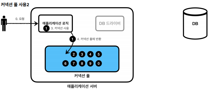 - 애플리케이션 로직은 커넥션 풀에서 받은 커넥션을 사용해서 SQL을 데이터베이스에 전달하고, 그 결과를 받아서 처리한다.
