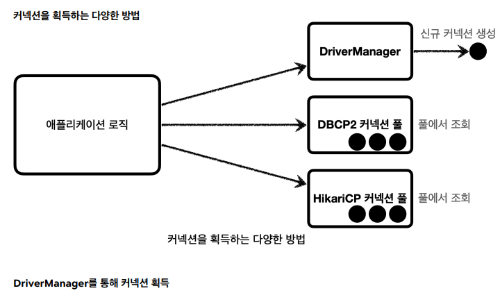 커넥션을 얻는 방법은 앞서 학습한 JDBC DriverManager를 직접 사용하거나, 커넥션 풀을 사용하는 등 다양한 방법이 존재한다.