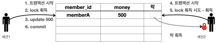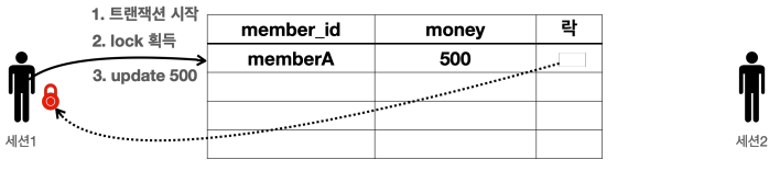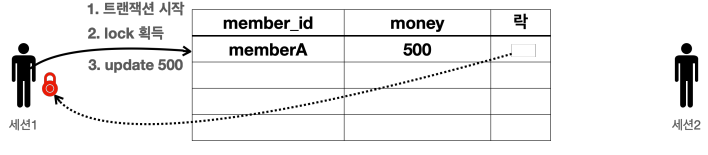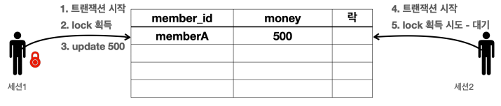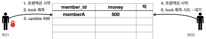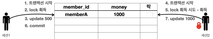 - 세션1은 memberA의 금액을 500원으로 변경하고 싶고, 세션2는 같은 memberA의 금액을 1000원으로 변경하고 싶다.