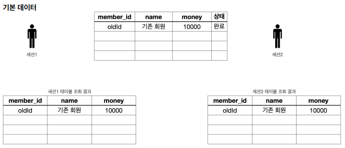 - 현재 세션1, 세션2 둘 다 가운데 있는 기본 테이블을 조회하면 해당 데이터가 그대로 조회된다.