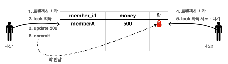 - 5. 세션2도 memberA의 money 데이터를 변경하려고 시도한다. 이때 해당 로우의 락을 먼제 획득해야 한다. 락이 없으므로 락이 돌아올때까지 대기한다.