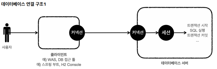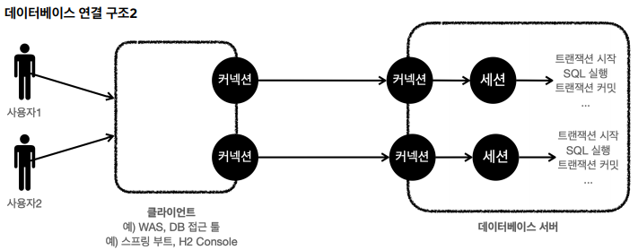 - 사용자는 웹 애플리케이션 서버(WAS)나 DB 접근 툴 같은 클라이언트를 사용하여 데이터베이스 서버에 접근할 수 있다. 클라이언트는 데이터베이스 서버에 연결을 요청하고 커넥션을 맺게 된다. 이때 데이터베이스 서버는 배우에 세션이라는 것을 만든다. 그리고 앞으로 해당 커넥션을 통한 모든 요청은 이 세션을 통해서 실행하게 된다.