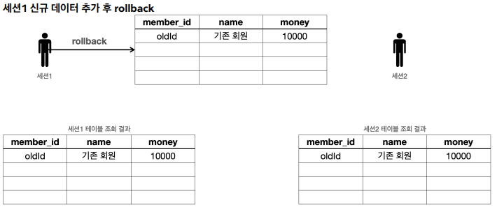 - 세션2에서 세션1이 아직 커밋하지 않은 변경 데이터가 보인다면, 세션1이 롤백 했을 때 심각한 문제가 발생할 수 있다. 따라서 컴빗 전의 데이터는 다른 세션에서 보이지 않는다.