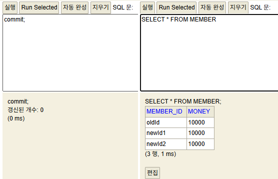 insert into member(member_id, money) values ('data1',10000); //자동 커밋