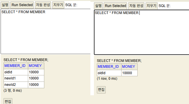 - memberEx 10000원 - 중간에 실패로 로직이 수행되지 않았다. 따라서 그대로 10000원으로 남아있게 된다.