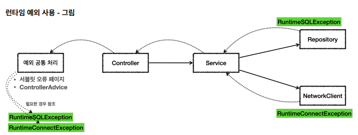 시스템에서 발생한 예외는 대부분 복구 불가능 예외이다. 런타임 예외를 사용하면 서비스나 컨트롤러가 이런 복구 불가능한 예외를 신경쓰지 않아도 된다. 물론 이렇게 복구 불가능한 예외는 일관성 있게 공통으로 처리해야 한다.