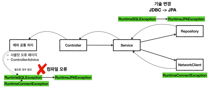 - JDBC -> JPA 같은 기술로 변경하면 예외도 함께 변경해야 한다. 그리고 해당 예외를 던지는 모든 다음 부분도 함께 변경해야 한다.