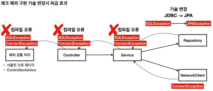 앞서 대부분의 예외는 복구 불가능한 예외라고 했다. 그런데 체크 예외이기 때문에 컨트롤러나 서비스 입장에서는 본인이 처리할 수 없어도 어쩔 수 없이 throws를 통해 던지는 예외를 선언해야 한다.