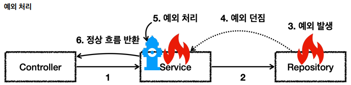 - 5번에서 예외를 처리하면 이후에는 애플리케이션 로직이 정상 흐름으로 동작한다.