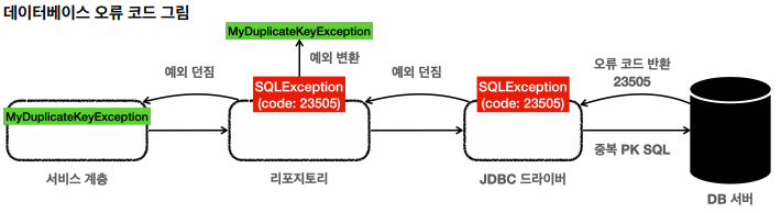 - 스프링은 예외 변환기를 통해서 SQLException의 ErrorCode에 맞는 적절한 스프링 데이터 접근 예외로 변환해준다.