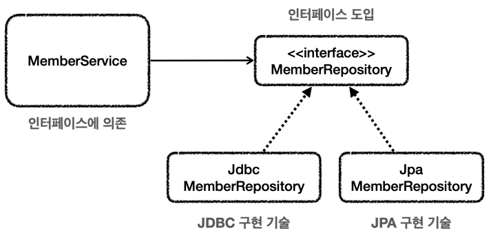 - 이렇게 인터페이스를 도입하면 MemberService는 MemberRepository 인터페이스에만 의존하면 된다.