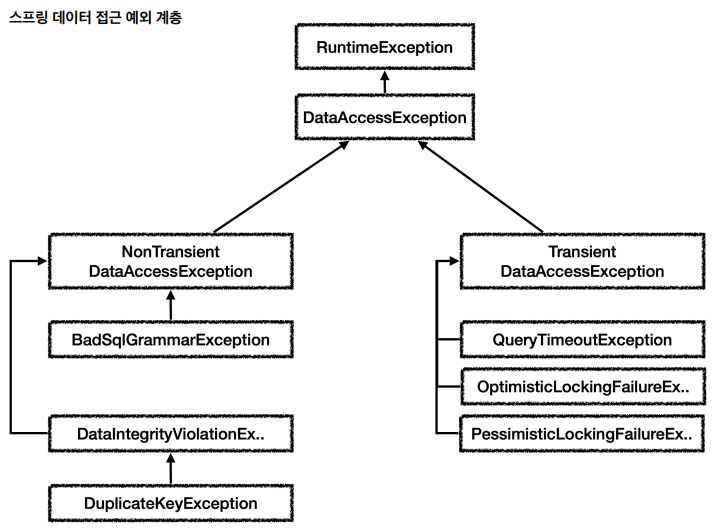 - 각각의 예외는 특정 기술에 종속적이지 않게 설계되어 있다. 따라서 서비스 계층에서도 스프링이 제공하는 예외를 사용하면 된다. 예를 들어서 JDBC 기술을 사용하든, JPA 기술을 사용하든 스프링이 제공하는 예외를 사용하면 된다.