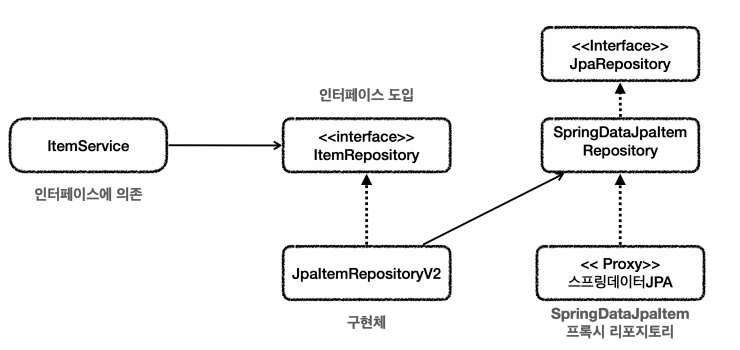 - ItemService는 ItemRepository에 의존하기 때문에 ItemService에서 SpringDataJpaItemRepository를 그대로 사용할 수 없다.