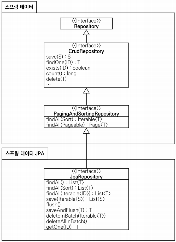 - 스프링 데이터 JPA가 제공하는 JpaRepository 인터페이스를 상속받으면 기본적인 CRUD 기능을 사용할 수 있다.