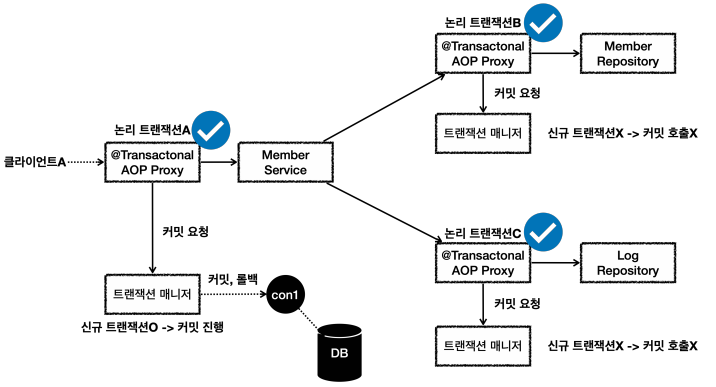 - 이미 트랜잭션이 있으므로 기존 트랜잭션에 참여한다.