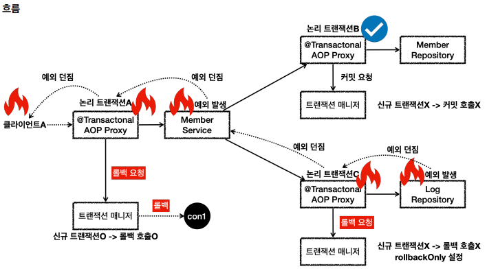 1. LogRepository에서 예외가 발생한다. 예외를 던지면 LogRepository의 트랜잭션 AOP가 해당 예외를 받는다.