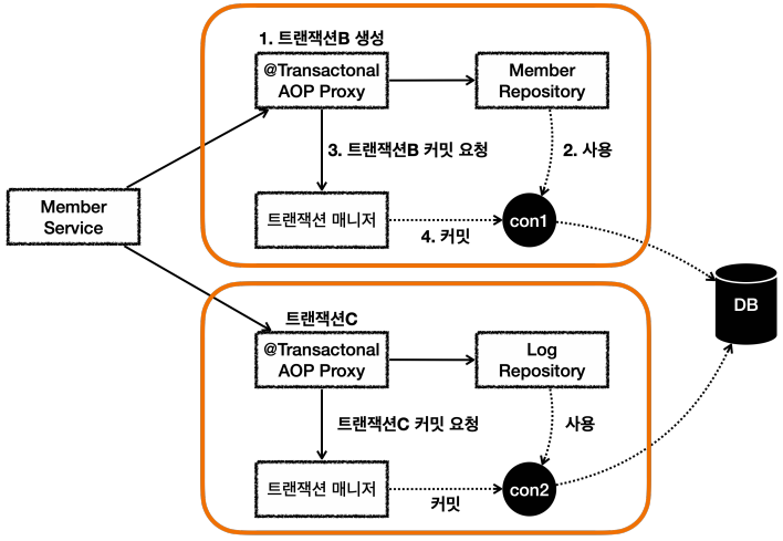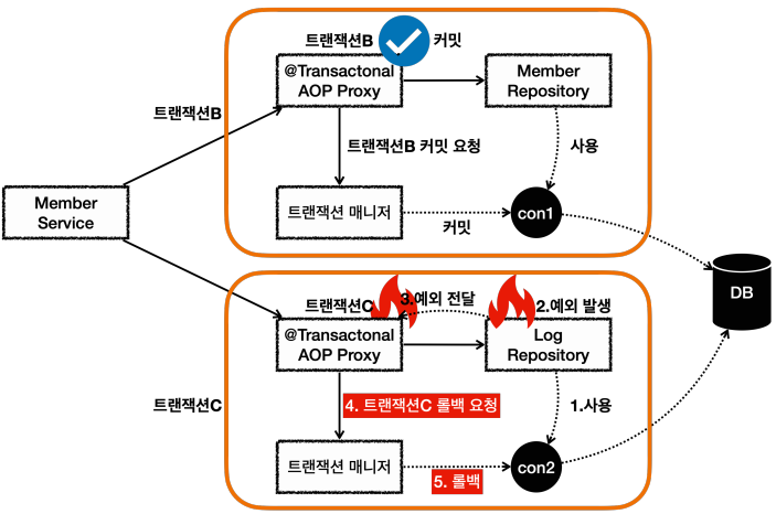 - 이렇게 하면 MemberService에서 정상 흐름으로 바뀌기 떄문에 MemberService의 트랜잭션 AOP에서 커밋을 수행할 수 있다.