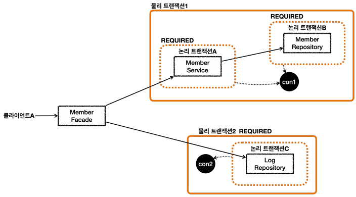 - 논리 트랜잭션은 하나라도 롤백되면 관련된 물리 트랜잭션은 롤백되어버린다.