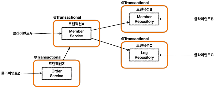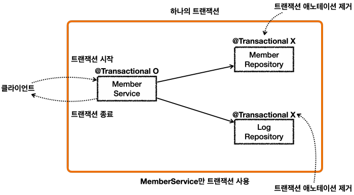 - MemberRepository는 REQUIRED 옵션을 사용한다. 따라서 기존 트랜잭션에 참여한다.