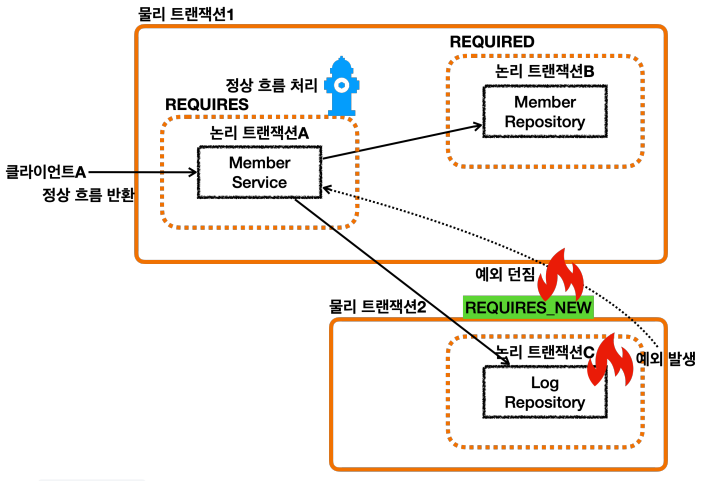 이 요구사항을 만족하기 위해서 로그와 관련된 물리 트랜잭션을 별도로 분리해보자. REQUIRES_NEW를 사용하여 분리를 하는 것이다.