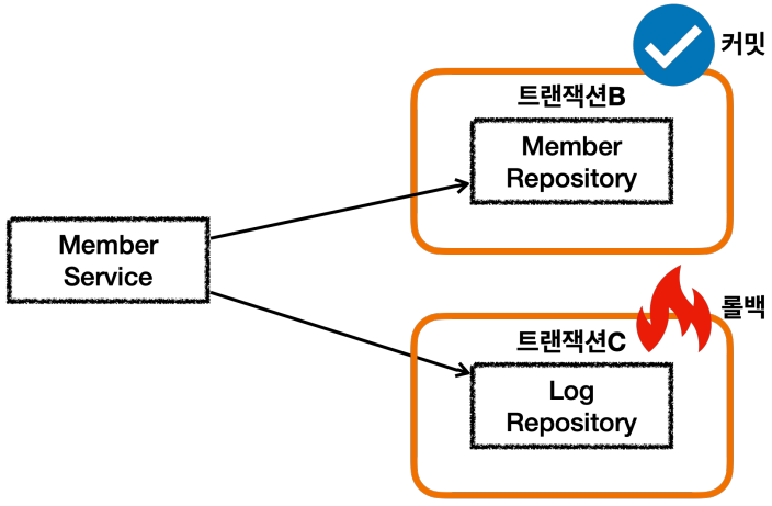 - 참고로 예제를 단순화 하기 위해 MemberService가 MemberRepository, LogRepository만 호출하지만 실제로는 더 많은 리포지토리들을 호출하고 그 중에 LogRepository만 트랜잭션을 분리한다고 생각하면 이해하는데 도움이 될 것이다.