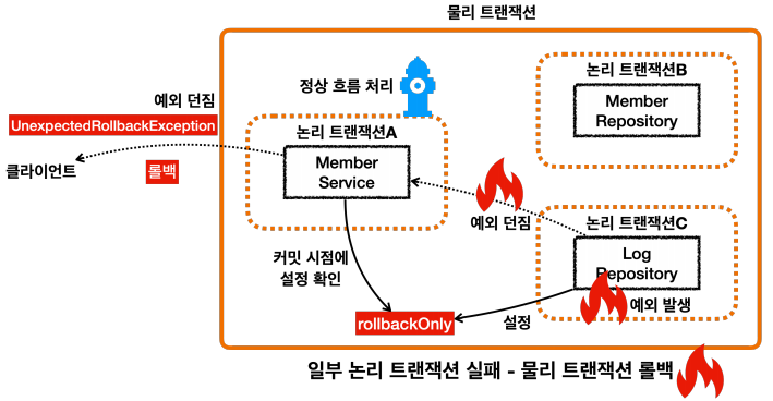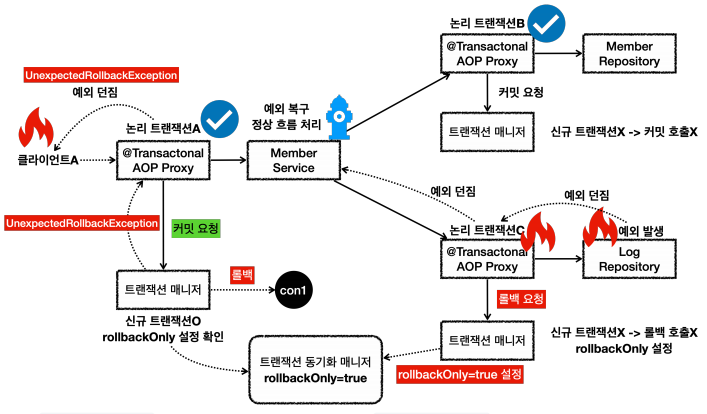 - rollbackOnly 상황에서 커밋이 발생하면 UnexpectedRollbackException 예외가 발생한다.