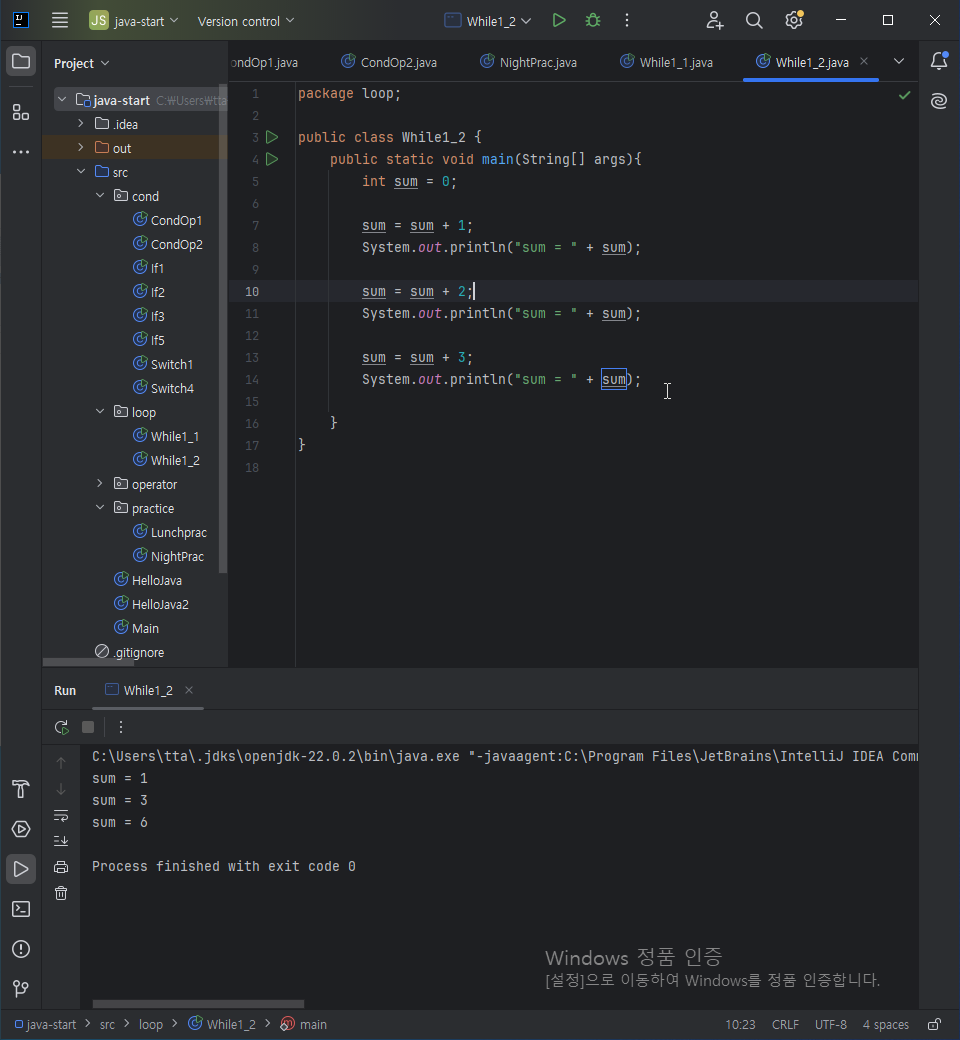 조건식을 확인한다. 조건식이 참이면 코드 블럭을 실행하고, 거짓이면 while문을 벗어나게 된다.