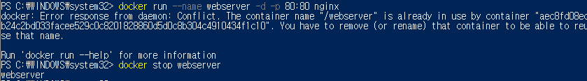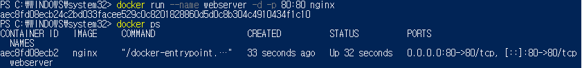 docker run --name webserver -d -p 80:80 nginx 를 통해 실행시킨다.