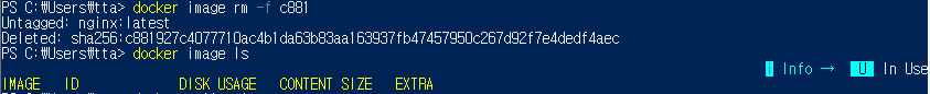 - rm -f를 사용하여 중지된 컨테이너에서 사용하고 있는 이미지를 강제로 삭제한다.