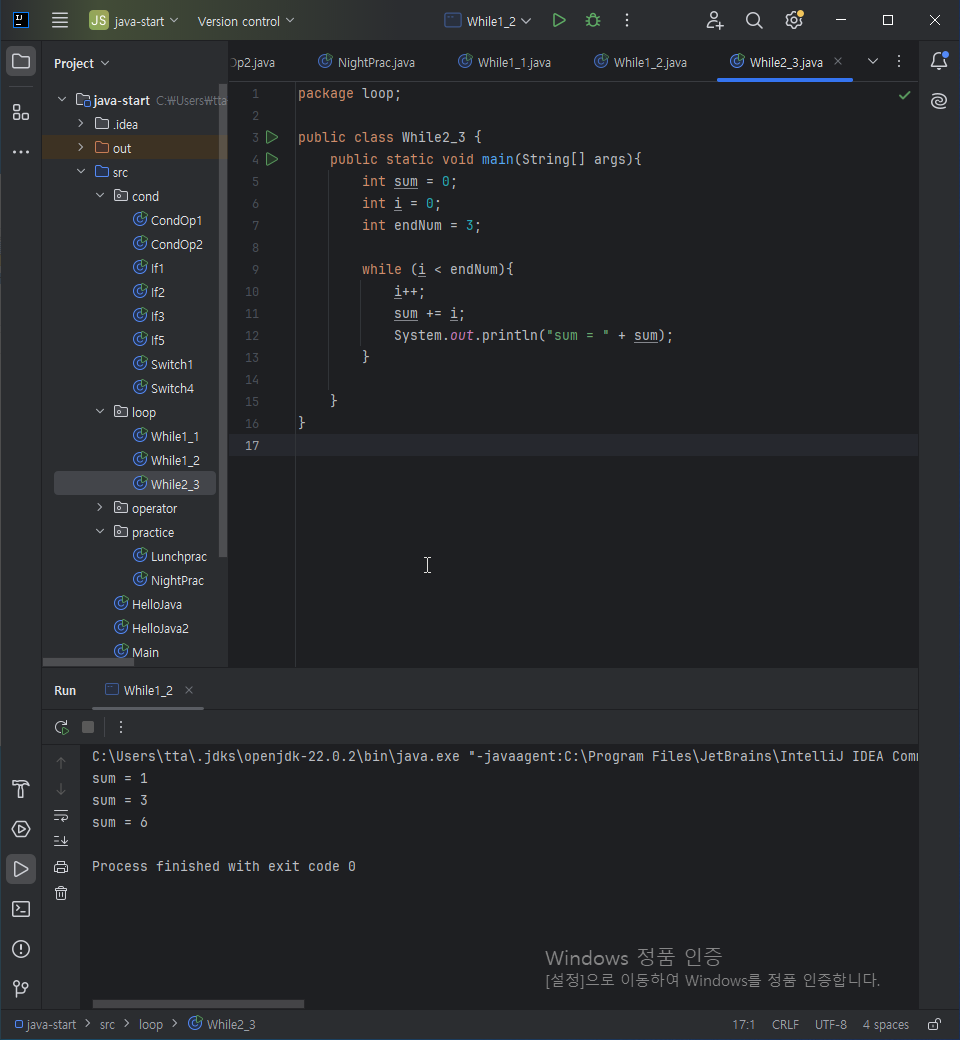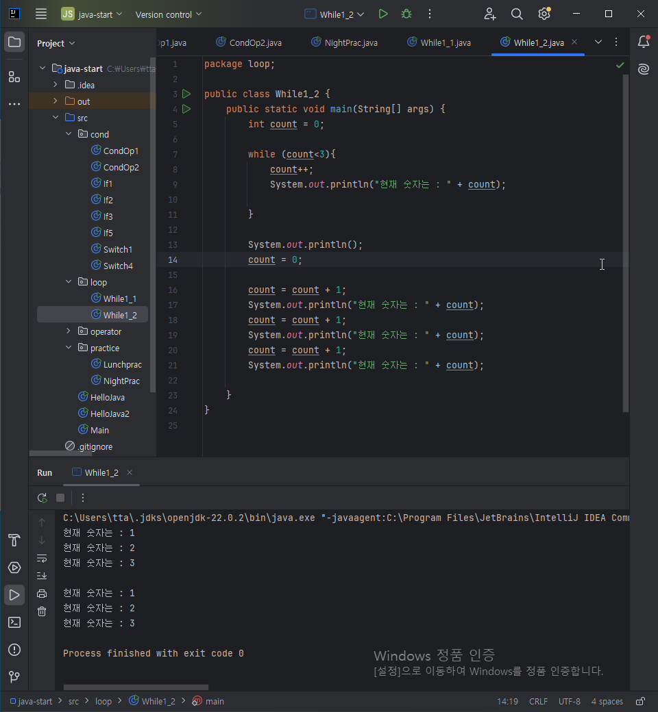 조건식을 확인한다. 조건식이 참이면 코드 블럭을 실행하고, 거짓이면 while문을 벗어나게 된다.
