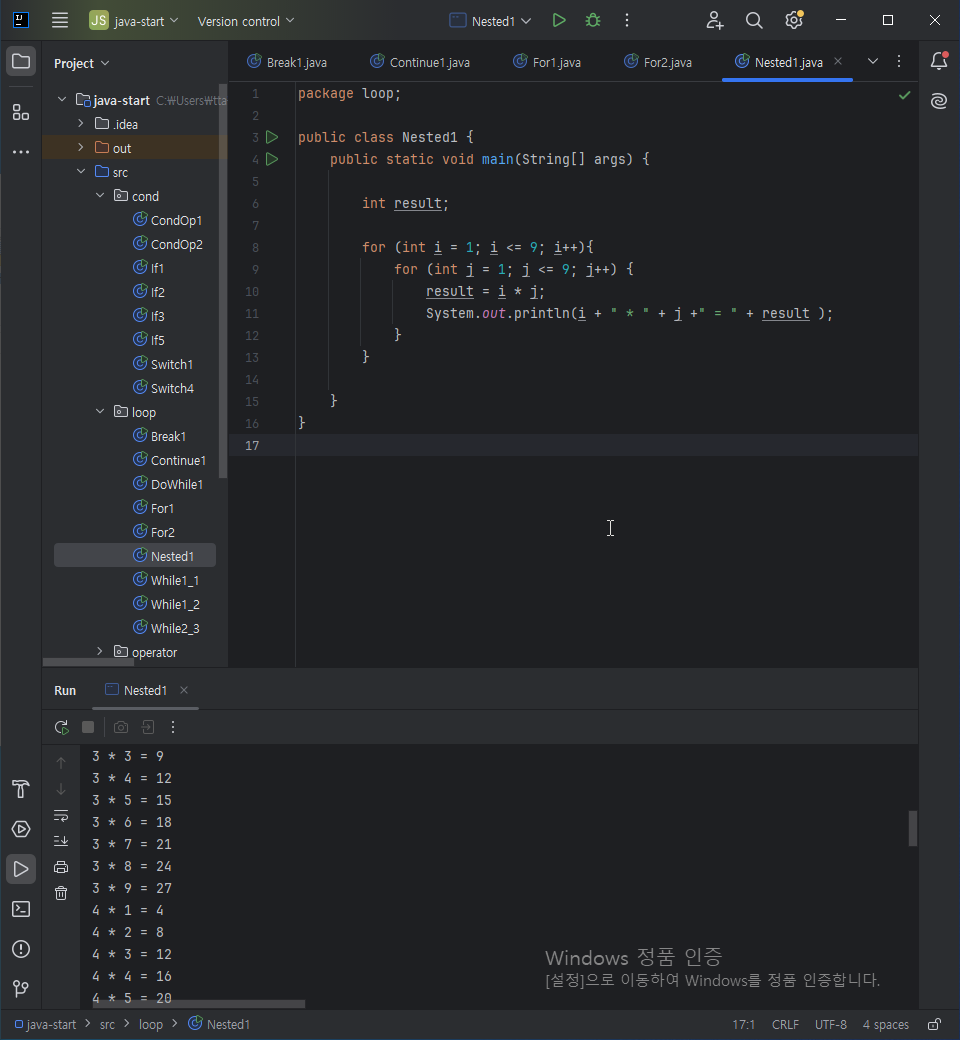 다음은 중첩 for문을 활용한 구구단 예제이다.