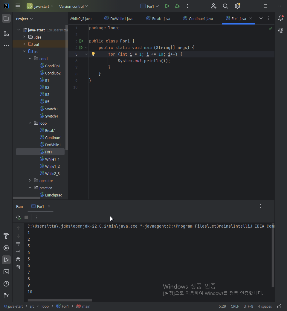 2. 조건식을 검증한다. 참이면 코드를 진행하고, 거짓이면for문을 빠져나간다.
