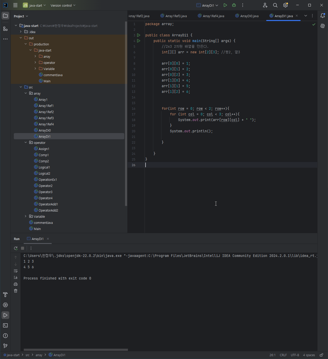 다음은 2x3 배열을 만들고 출력하는 예제이다.