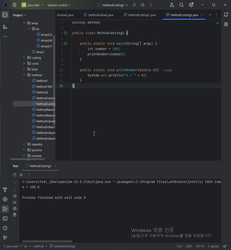 메서드를 호출할 때도 형변환이 적용될 수 있다. 메서드 호출과 명시적 형변환, 자동 형변환을 보자.
