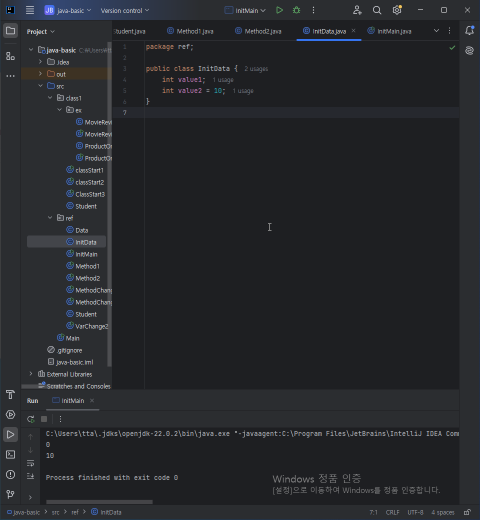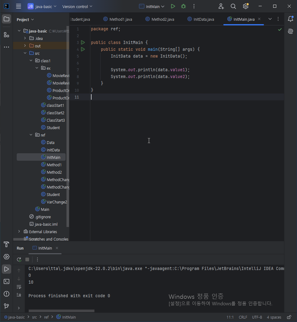 InitData에서 Data.value1를 호출하면 자동으로 0으로 초기화 된 값이, Data.value2는 이미 초기화 해 준 10이 출력된다.