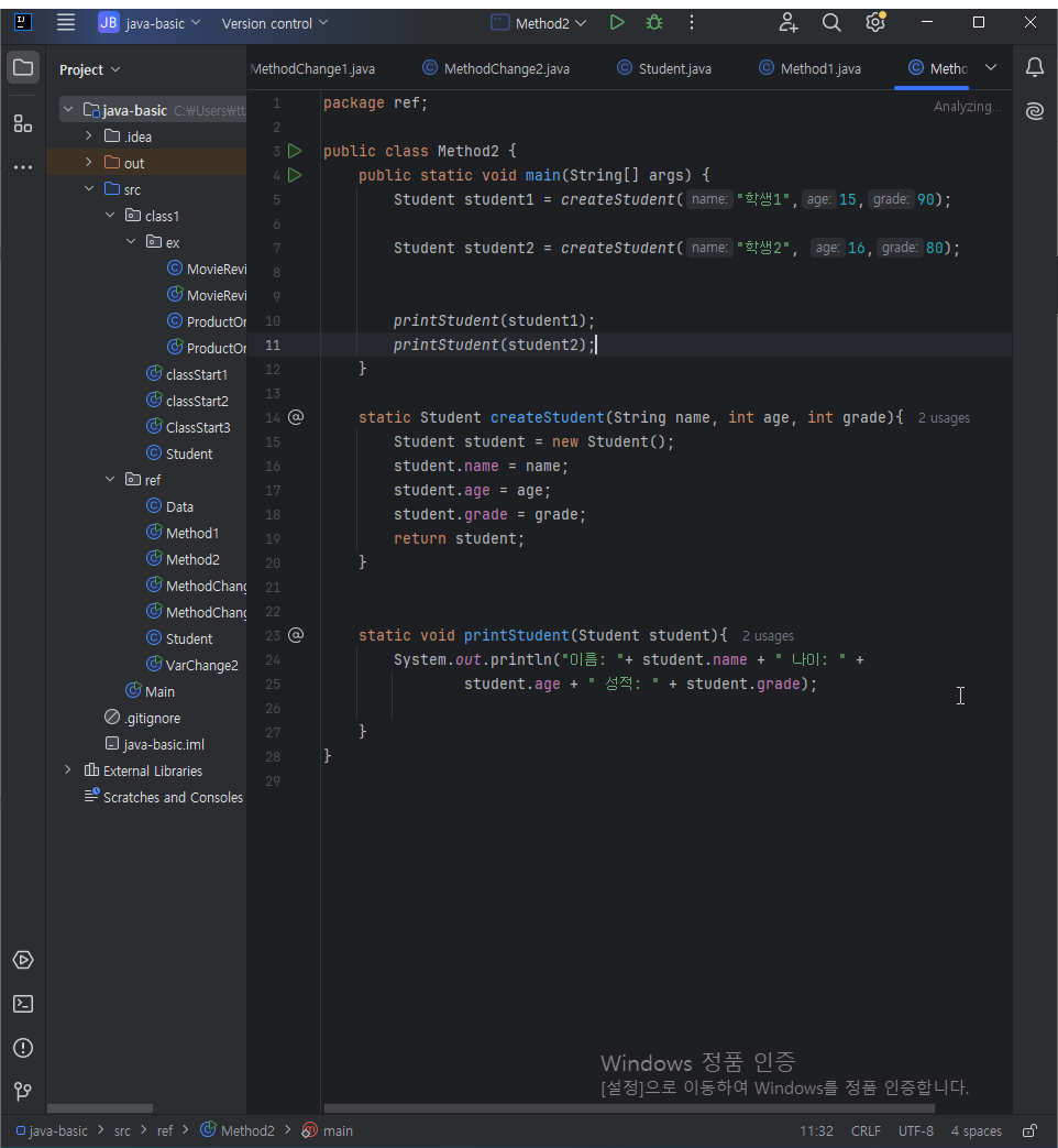 이 Student 메서드는 매개변수로 이름, 나이, 점수를 받고 Student라는 인스턴스를 생성하여 그 인스턴스에 이름, 나이, 점수를 집어넣은 후 return student를 통해 참조값을 반환한다.