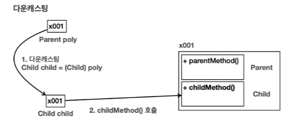 Parent poly = new Child()와 같이 부모 타입의 변수를 사용하게 되면 poly.childMethod()를 사용할 수 없다.