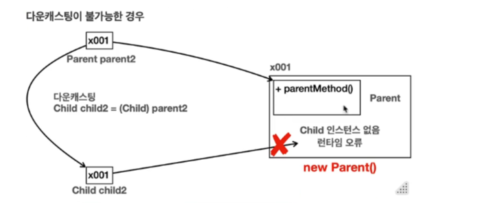 왜냐하면 Parent타입을 만들었는데 이 Parent타입은 메모리상에 자식 타입이 존재하지 않기에, 다운캐스팅을 하여도 Child 자체를 사용할 수 없어서이다.