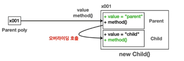 poly는 Parent 타입이다. 따라서 poly.value, poly.method()를 호출하면 인스턴스의 Parent 타입에서 기능을 찾아서 실행한다. 하지만 Parent타입에 있는 method()는 child에서 오버라이딩 되어있다. 앞서 말했듯 메서드는 오버라이딩 된 메서드가 우선권을 가지기 때문에 Parent.method()가 아니라 Child.method()가 실행된다.