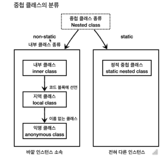 중첩 클래스는 클래스를 정의하는 위치에 따라 다음과 같이 분류한다.